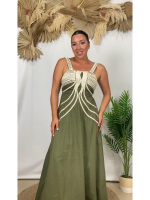 º Es un vestido largo, con un diseño de dos texturas. La parte superior tiene un estilo sencillo y cómodo, similar a una sudadera ligera de manga larga, con un corte recto y holgado que cae de ,manera fluida.