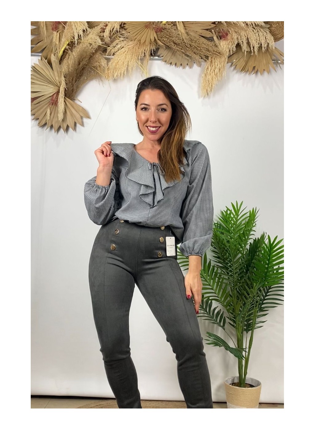 º Camisa con volante en el pecho y mangas abullonadas con puño elástico.