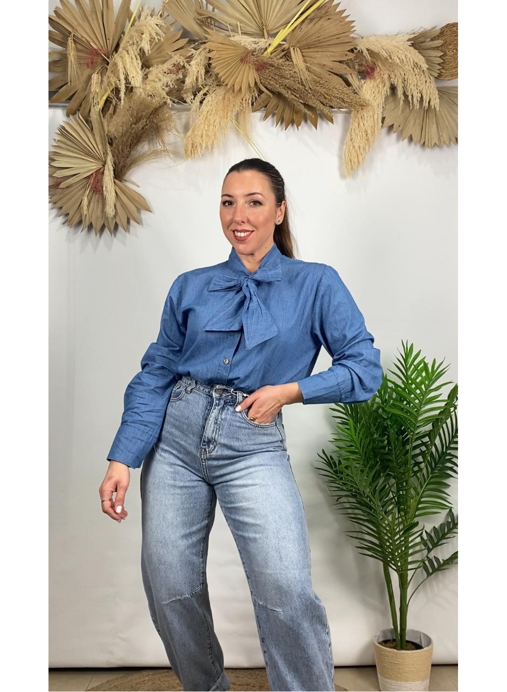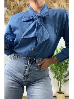 º Camisa vaquera abotonada y lazada en el cuello.