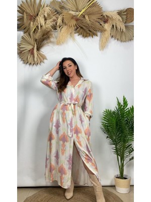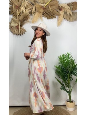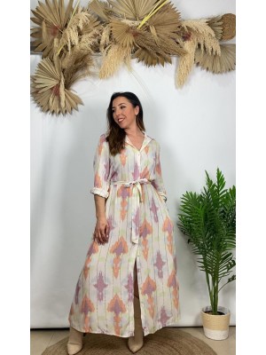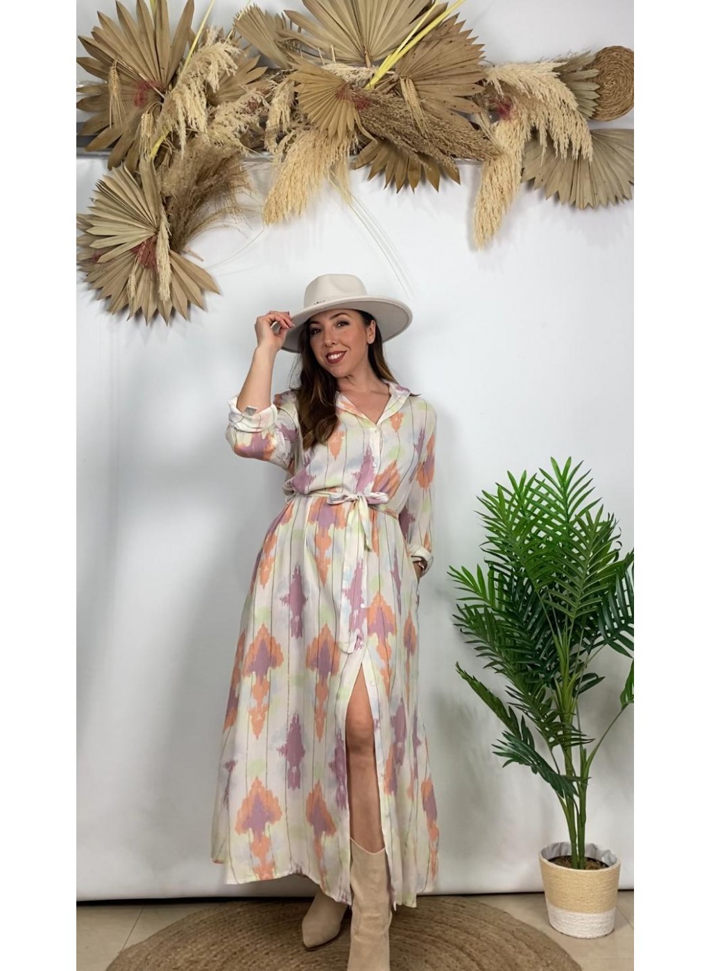 º Vestido camisero con largo midi, bolsillos laterales y cinturón de la misma tela.