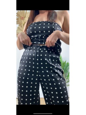 º Pantalón pata ancha con cintura elástica en la parte de atrás, cierre con botón y cremallera, incluye bolsillos.