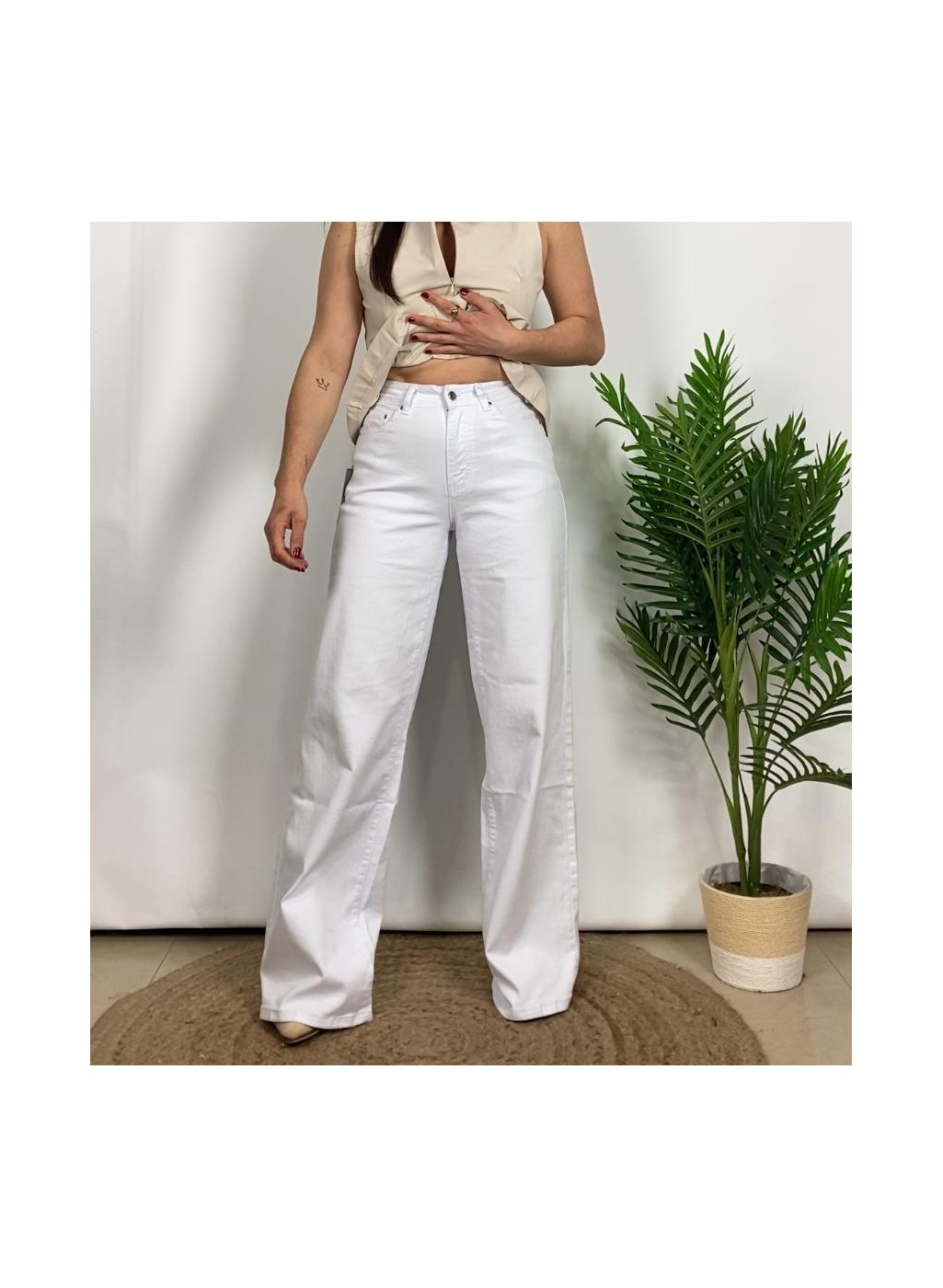 º Jeans tiro alto, cierre con botón y cremallera.