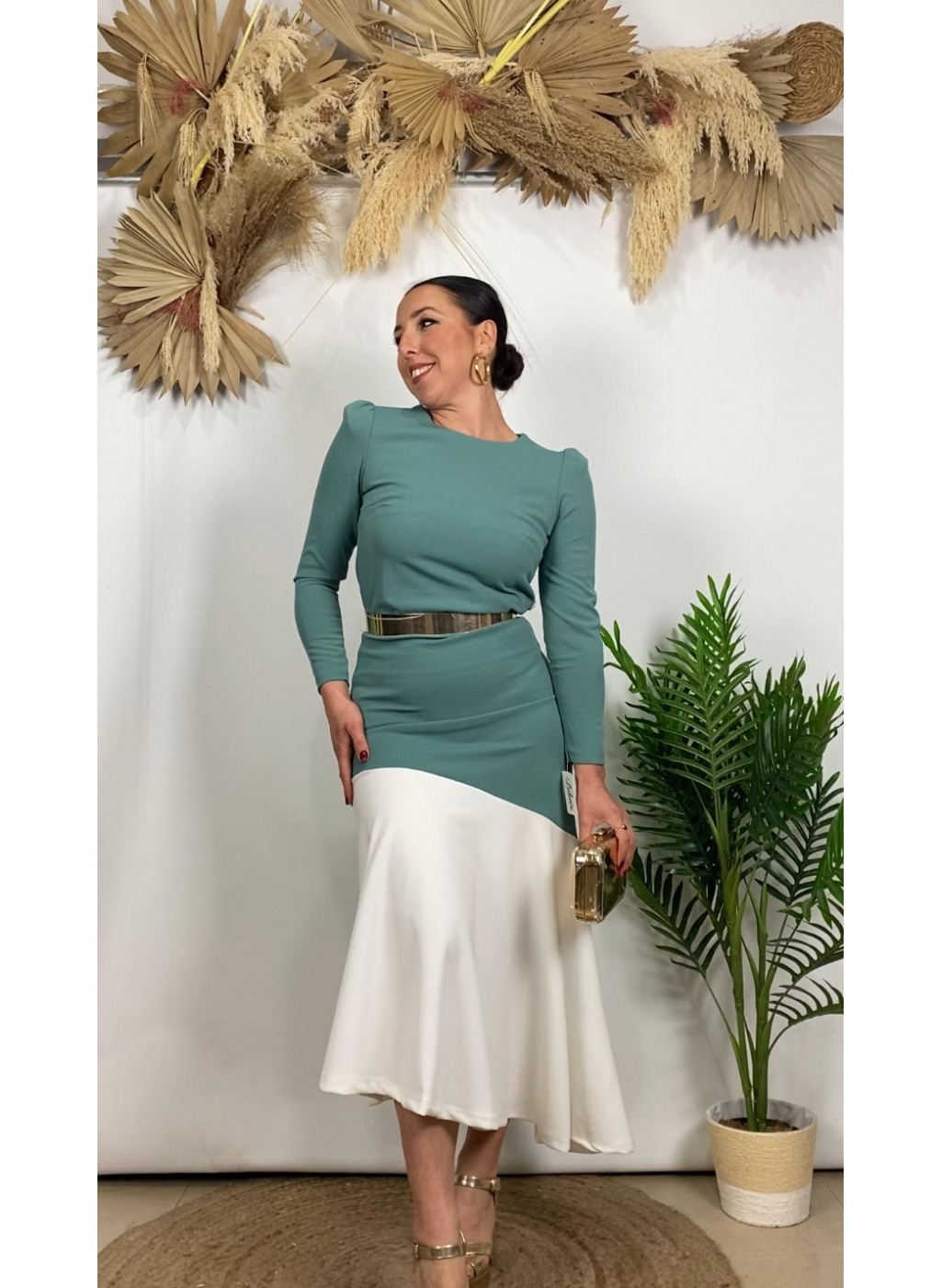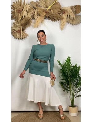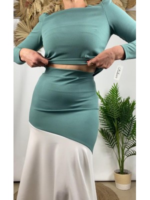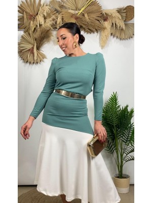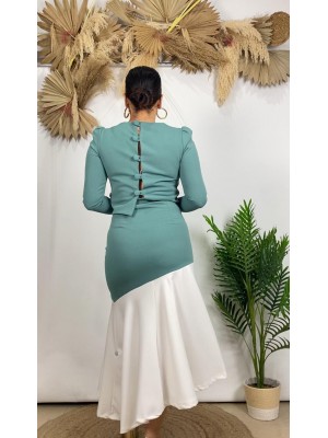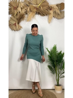 º Conjunto tejido crepe, compuesto por falda con largo midi y blusa con cierre de botones en la espalda.